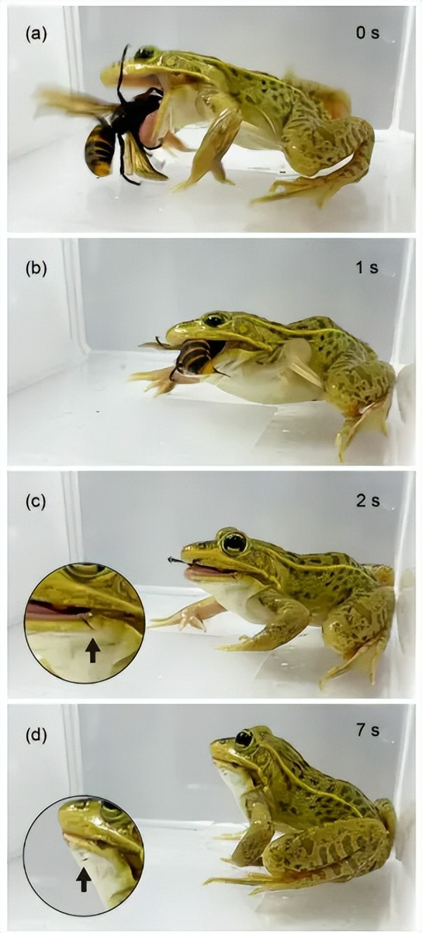 但自然界当中总会存在例外情况,少数鸟类、蜘蛛乃至两栖动物会去捕食成年的黄蜂,池塘蛙就是其中的一个例子,然而以往的研究,大多仅仅停留在「在胃内容物中发现黄蜂残留」这种情况,可这并不能说明青蛙到底是靠着忍受毒刺存活下来的,还是通过快速捕猎来避开被蜇的。